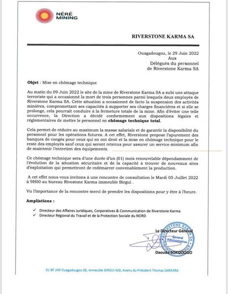 Ce chômage technique fait suite à l’attaque terroriste que le site de la mine de Riverstone Karma SA a subi au matin du 09 Juin 2022. L’attaque a occasionné la mort de 3 personnes parmi lesquels 2 employés de Riverstone Karma SA et un agent des forces de défense et de la sécurité. « Cette situation a occasionné de facto la suspension des activités minières, compromettant ses capacités à supporter ses charges financières et si elle se prolonge, cela pourrait conduire à la fermeture totale de la mine », informe la direction générale de la mine. « Afin d’éviter une telle occurrence, la Direction a décidé conformément aux dispositions légales et réglementaires de mettre le personnel en chômage technique total », poursuit-elle.