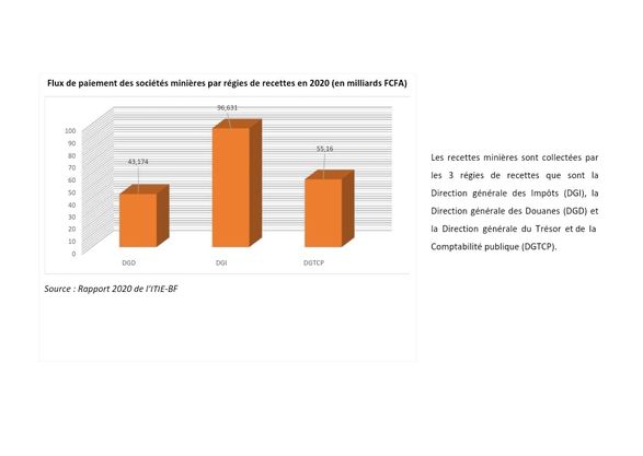 La DGI a collecté le plus avec 96,631 milliards FCFA. Elle est suivie de la DGTCP (55,160 milliards FCFA) et de la DGD (43,174), selon les déclarations du gouvernement rapportées par le rapport 2020 de ITIE-BF.
