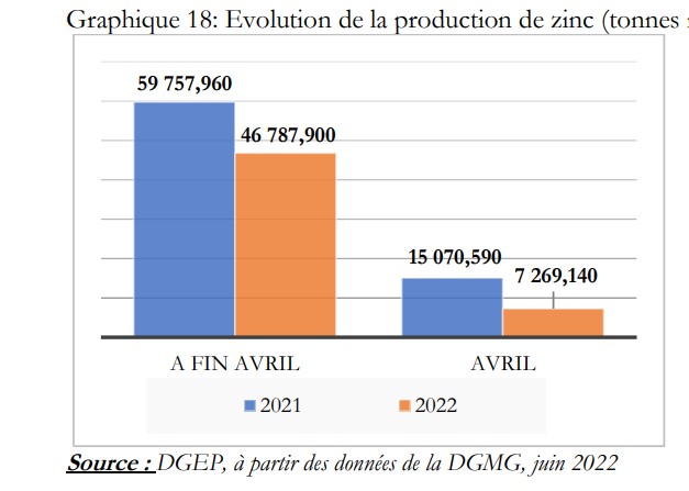 Outre l’or, le Burkina Faso produit du zinc. Avec l’arrêt des activités de la mine de Perkoa suite à l’inondation du 16 avril 2022, la production de zinc est nulle en juin et juillet 2022. A fin avril 2022, la production totale de zinc ressort à 46 787,900 tonnes, en baisse de 21,7% par rapport à fin avril 2021.