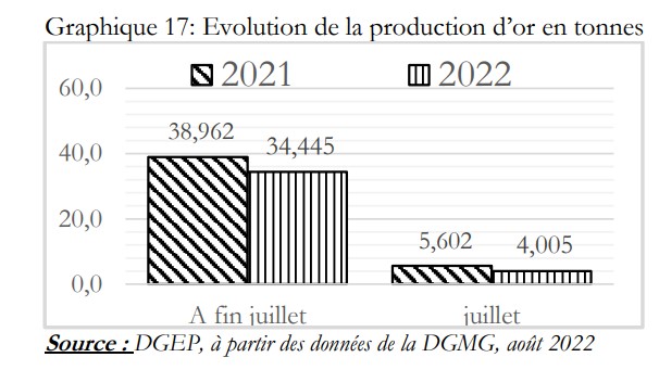 La baisse de la production d’or aura un impact sur la contribution du secteur minier dans l’économie du pays et des collectivités. Cet impact sera accentué par la baisse du cours de l’once d’or qui poursuit sa tendance baissière entamée en avril 2022, s’affichant à 1 738,8 dollars US en juillet 2022, après le pic de 1947,4 dollars en mars 2022. Il enregistre une baisse de 5,3% par rapport à juin 2022. En glissement annuel, il est en repli de 3,7%, selon la DGEP.