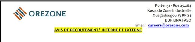 Veuillez postuler directement en envoyant votre dossier complet Scanné en un FICHIER UNIQUE à l’adresse électronique suivante : careers@orezone.com au plus tard le Dimanche 16 Octobre 2022 à 16 h. Bien vouloir préciser le titre du poste en Objet du mail