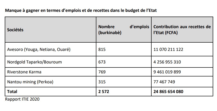 Le nombre d’emplois menacés est estimé 2572 suite à la fermeture des 6 projets miniers. La fermeture de ces mines engendre aussi un manque à gagner en termes de recettes de l’Etat. Le manque à gagner en termes de recettes est d’environ 24,865 milliards FCFA. Cette somme ne prend pas en compte le manque à gagner pour les budgets des collectivités qui ne recevront plus les taxes superficiaires, les patentes, le fonds minier de développement local, etc. Les 24,8 milliards FCFA ne prennent pas non plus en compte les pertes de marchés pour les entreprises sous-traitantes au niveau local qui ne vont plus payer des impôts locaux et employer du personnel local.