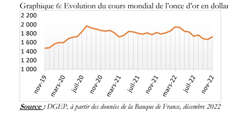 La baisse de la production est compensée en partie par la bonne tenue du cours de l’or. En novembre 2022, le cours de l’once d’or a connu une hausse de 3,6% par rapport à octobre 2022. Il est passé de 1665,6 dollars US en octobre 2022 à 1 725,4 dollars US en novembre 2022. En glissement annuel, il est en baisse de 5,2% puisque était fixé à 1820,3 dollars US en novembre 2021. Le niveau du cours de l’or demeure élevé en lien avec les incertitudes qui pèsent sur l’économie mondiale.