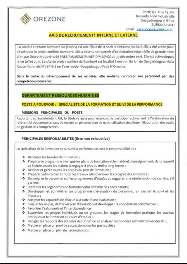 La mine OREZONE BOMBORE SA recrute un Spécialiste de la formation et suivi de la performance
