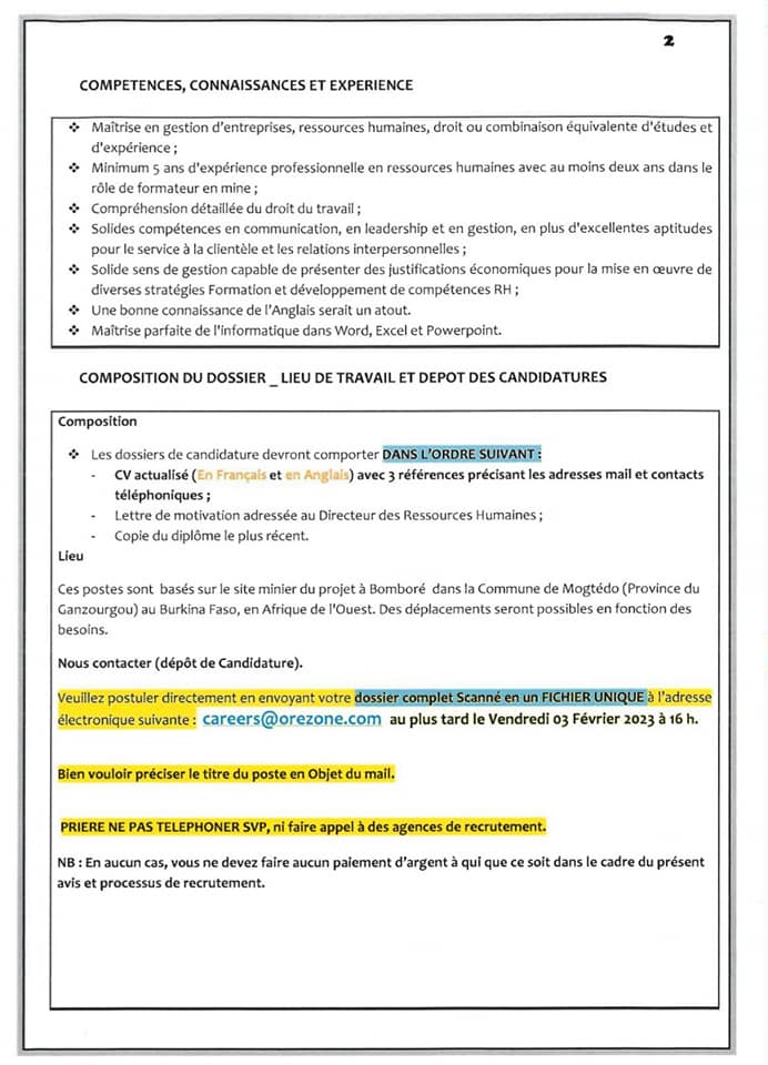 Candidature à envoyer à l’adresse : careers@orezone.com au plus tard le vendredi 03 février 2023 à 16 heures.