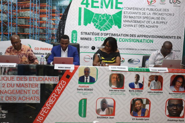 Les étudiants de la deuxième promotion du Master spécialisé en management de la Supply Chain et des achats ont organisé une conférence publique le jeudi 16 février 2023 à Ouagadougou. Avec pour thème « Stratégie d’optimisation des approvisionnements en mines : stock en consignation », cette conférence publique a eu pour objectif de permettre aux participants de prendre connaissance du fonctionnement du stock en consignation, ses avantages, les difficultés rencontrées et comment y remédier.