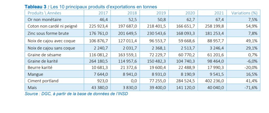 En termes de volumes, les exportations de l’or ont connu une augmentation de 7,5% pour s’établir à 67,4 milliers de tonnes en 2021. Quant au coton, les exportations représentent 258,199 milliers de tonnes en 2021 contre 166 651,7 milliers de tonnes en 2020, soit une hausse de 54,9%. Les quantités exportées du zinc brut sont passées à 181 253,4 milliers de tonnes, soit une augmentation de 7,8%. Un accroissement de 48,3% des quantités exportées des noix de cajou a été également observée.