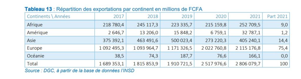 L’analyse de l’évolution des exportations par continent indique que les exportations du Burkina Faso à destination de tous les continents en 2021 ont connu une augmentation par rapport à 2020. Ainsi l’Europe est restée la première destination en termes d’exportations avec une valeur de 2 115,2 milliards de FCFA, soit 75,4% de la valeur totale des exportations. Cette grosse part se justifie par les exportations d’or e, direction de l’Europe. Les parts des autres continents sont de 14,4% pour l’Asie, 9,0% pour l’Afrique et 1,2% pour l’Amérique.