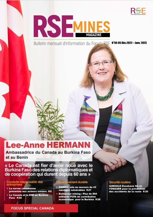 Le Burkina Faso et le Canada ont célébré en 2022, le 60e anniversaire de la coopération Burkina-Canada. A cette occasion, RSE Mines Magazine a donné la parole à son Excellence, Lee-Anne Hermann, Ambassadrice du Canada au Burkina Faso et au Bénin. Elle parle des relations entre les deux pays, présente la nouvelle stratégie de Responsabilité sociale des entreprises axée sur la notion de Conduite Responsable des Entreprises et apporte des précisions sur la contribution du Canada au développement du Burkina Faso. https://minesactu.info publie les parties de l’interview qui concernent le secteur minier.