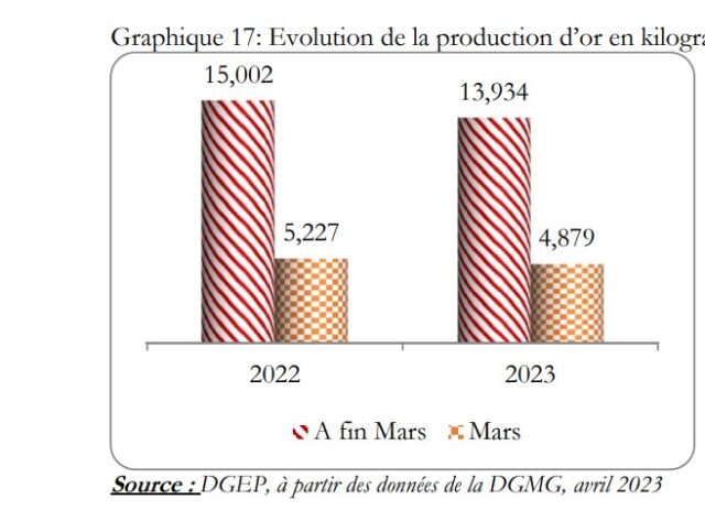 Si l’on compare la production de mars 2023 à mars 2022, on observe une baisse de 6,7% entre les 2 périodes. Cette baisse de la production en mars 2023 a eu un impact sur la production du premier trimestre. En effet, de janvier à mars 2023, la production totale d’or fin est de 13,934 tonnes contre 15,002 tonnes à fin mars 2022, soit un recul de 7,1%.