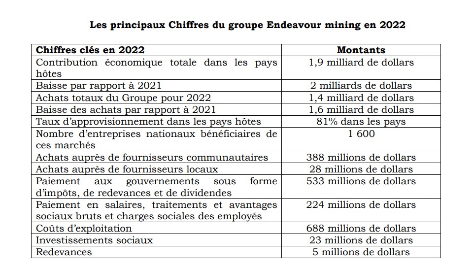 Les achats totaux du Groupe pour 2022 se sont élevés à 1,4 milliard de dollars, en baisse par rapport à 1,6 milliard de dollars en 2021 en raison de la cession de la mine Karma en mars 2022, entraînant une diminution des achats dans le pays de 1,3 milliard de dollars en 2021 à 1,1 milliard de dollars en 2022. Malgré cette baisse globale, le Groupe s’est approvisionné à 81% dans les pays hôtes en 2022, soit une augmentation de 1 point de pourcentage par rapport à 2021. Endeavour a soutenu environ 1 600 entreprises nationales et locales en Côte d’Ivoire, au Sénégal, au Burkina Faso et en Guinée en 2022. Les achats auprès de fournisseurs communautaires « appartenant à des intérêts nationaux » et locaux touchés ont totalisé 388 millions de dollars et 28 millions de dollars respectivement pour 2022. Endeavour a versé 533 millions de dollars aux gouvernements hôtes sous forme d’impôts, de redevances et de dividendes, 224 millions de dollars en salaires, traitements et avantages sociaux bruts et charges sociales des employés, 688 millions de dollars en coûts d’exploitation excluant les coûts de personnel, 23 millions de dollars en investissements sociaux et 5 millions de dollars en redevances à des tiers pour l’exercice 2022. En 2022, Endeavour a investi un total de 23 millions de dollars en investissements sociaux, dont 16 millions de dollars versés aux Fonds miniers de développement local et 7 millions de dollars investis dans divers projets communautaires.
