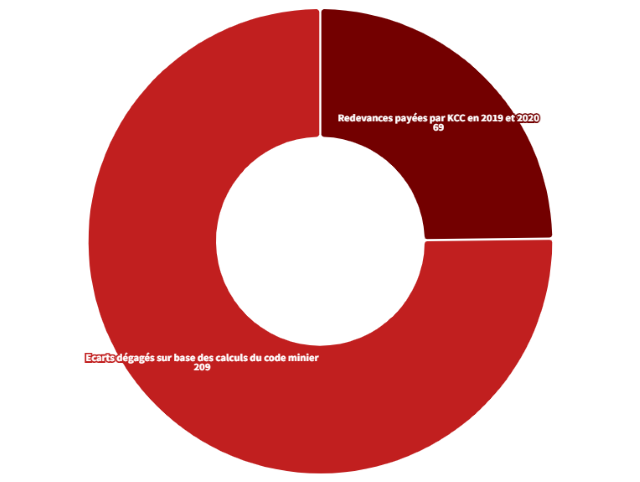 En 2020, elle aurait dû payer sur le cuivre une redevance de 58 457 700,5 $ (soit le 3,5 de 1 670 220 000 $ et 110 649 830 $ (soit le 10 % de 1  106 498 300 $). Ceci signifie que KCC aurait dû payer 169 107 530 $. Si l’on déduit la redevance payée de 35 842 666, 01 USD de ce chiffre, le manque à gagner est à 133 264 863,99 $. En somme,  en se basant sur ces chiffres sur les deux années 2019 et 2020, le total des manques à gagner serait de  209 210 397,5 $.