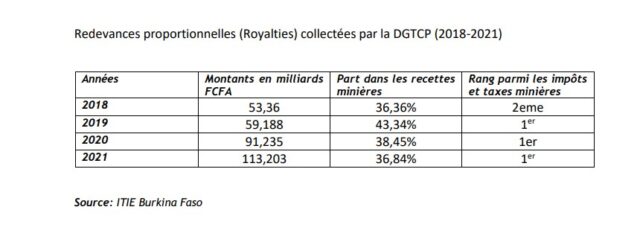 En effet, aux termes du Décret n°2017-0023/PRES/PM/MEMC/MINEFID du 23 janvier 2017, portant fixation des taxes et redevances minières, les royalties sont perçues au Burkina Faso de manière progressive : 3% si le cours de l’or est inférieur à 1.000 dollars l’once ; 4% s’il est compris entre 1.000 et 1.300 dollars l’once ; 5% lorsqu’il dépasse 1.300 dollars l’once.