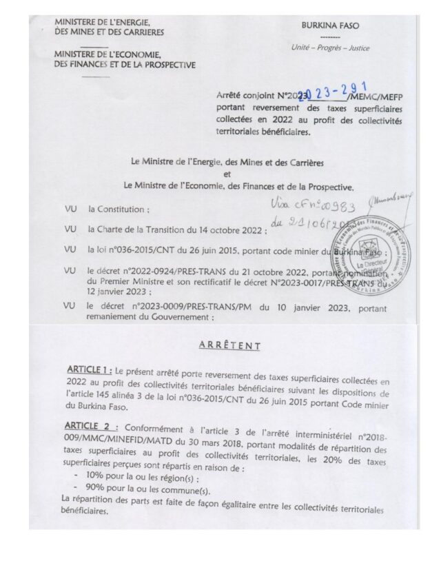Le 7 juillet 2023 les ministres des Mines et des Finances ont signé l’arrêté conjoint portant reversement des taxes superficiaires au profil des collectivités territoriales bénéficiairesau titre de l’année 2022.