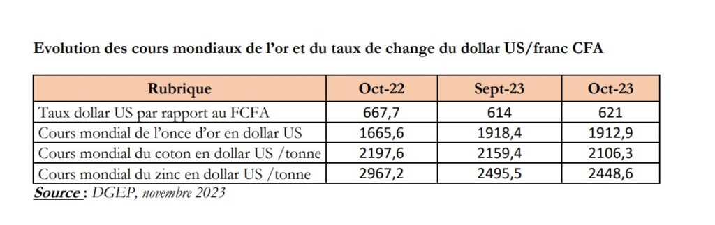 Une baisse de la production compensée par une bonne tenue des cours de l’or. Même si ce cours connait une légère baisse depuis maintenant 3 mois, son niveau actuel reste élevé. En effet, le cours de l’or affiche 1 912,9 dollars US en fin octobre 2023 contre 1 918,4 dollars US en septembre 2023, soit une légère contraction de 0,3%. Rapporté à son niveau d’octobre 2022, le cours de l’once d’or est en progression de 14,8%. « La baisse du cours de l’or en octobre 2023 s’expliquerait par les niveaux des taux d’intérêt qui restent élevés de même que l’inflation. De plus, le cours du dollar américain s’est de nouveau renchérit au cours de ce mois, plombant ainsi celui de l’or », explique le rapport de la DGEP.