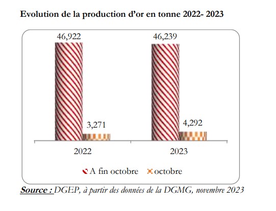 Entre janvier et octobre 2023, la production totale d’or est de 46,239 tonnes. Elle est en baisse de 1,5% par rapport à la même période en 2022 où elle a affiché 46,922 tonnes à fin octobre 2022. Ces chiffres sont rapportés par le Rapport de suivi des indicateurs de l’économie et du développement de novembre 2023, publiés par la Direction générale de l’Economie et de la Planification (DGEP).