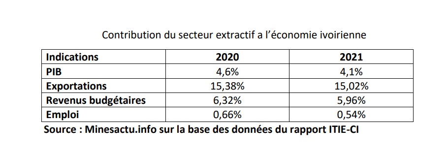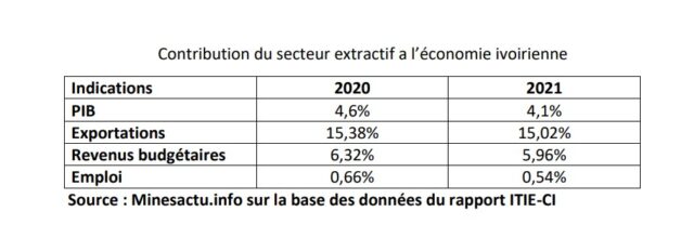 En 2021, la contribution du secteur extractif ivoirien dans l’économie a baissé sur l’ensemble des sous-secteurs. La contribution au Produit intérieur brut (PIB) est passée de 4,6% en 2020 à 4,1% en 2021. Au compte des exportations, de 2020 à 2021 une baisse de 0,36% a été enregistrée. La part des exportations du secteur extractif dans les exportations totales passe de 15,02% en 2021 pour 15,38% en 2020. Les revenus budgétaires et le taux d’emploi ont aussi chuté en termes de statistique. Les revenus budgétaires du secteur extractif ivoirien sont passés de 6,32% en 2020 à 5,96% en 2021. Les emplois passent de 0,66% à 0,54% en 2021.