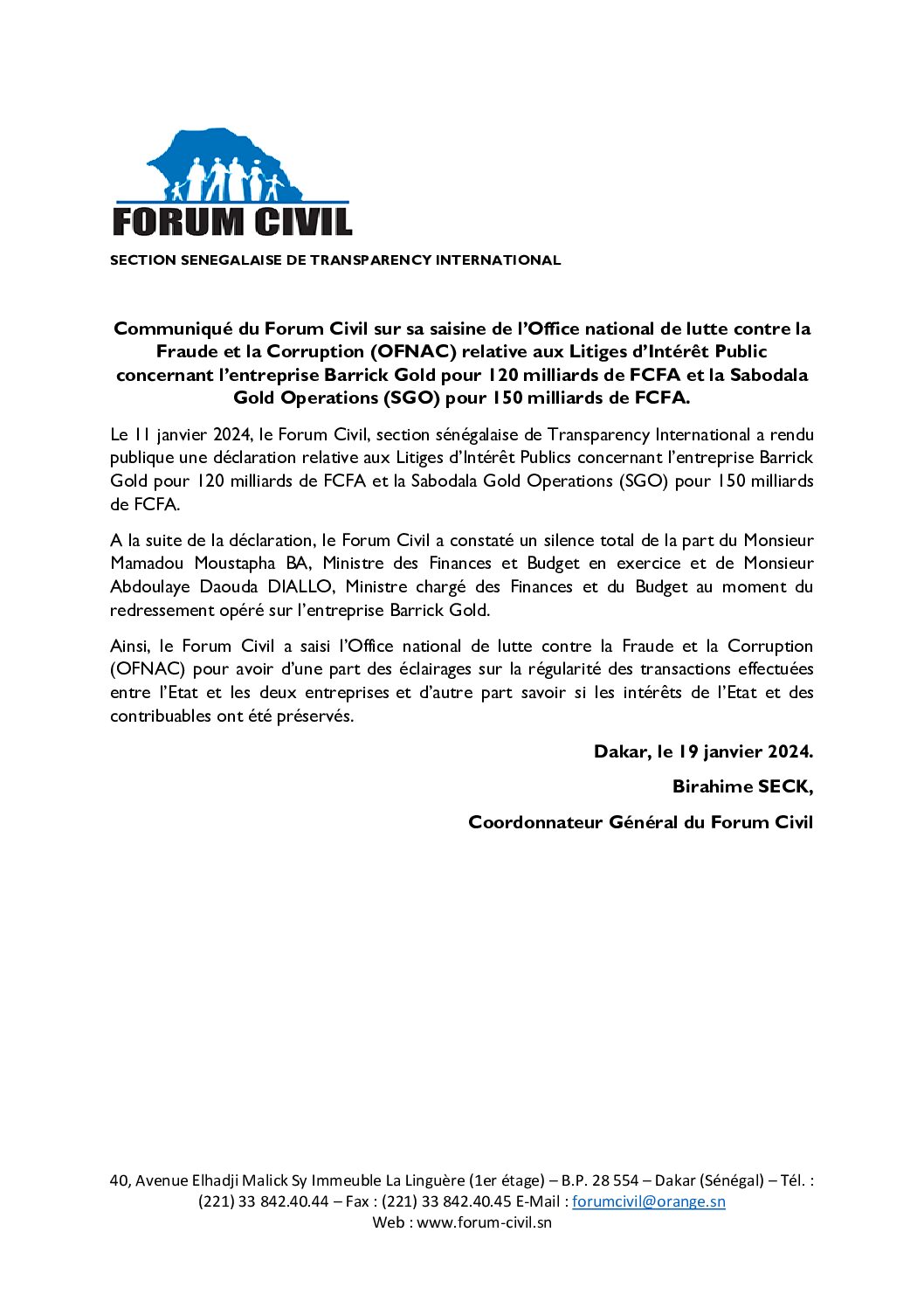 Dans son communiqué, le Forum Civil fait cas du silence du ministre des Finances et Budget en exercice, Mamadou Moustapha Ba et de Abdoulaye Daouda Diallo, ministre chargé des Finances et du Budget au moment du redressement opéré sur l’entreprise Barrick Gold. En rappel, le 11 janvier 2024, le Forum avait déjà publié une déclaration sur le sujet. Le Forum Civil indique par le biais de son communiqué avoir saisi l’Office national de lutte contre la Fraude et la Corruption (OFNAC) dans le but d’avoir des éclairages sur la régularité des transactions effectuées entre l’Etat et les deux entreprises et d’autre part savoir si les intérêts de l’Etat et des contribuables ont été préservés.