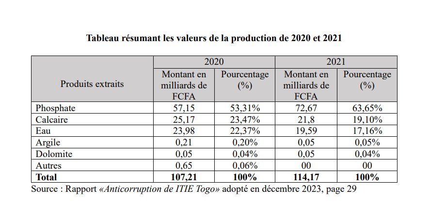 La production du secteur extractif togolais s’élève à plus de 114 milliards de FCFA pour l’année 2021. Ces données émanent d’un rapport dénommé «Rapport anticorruption de ITIE Togo» publié parl’Initiative pour la transparence dans les industrie extractives (ITIE) en décembre 2023. Le rapport donne des détails sur la quantité et la valeur de chaque ressource extraite en 2021 en comparaison à celle de 2020.