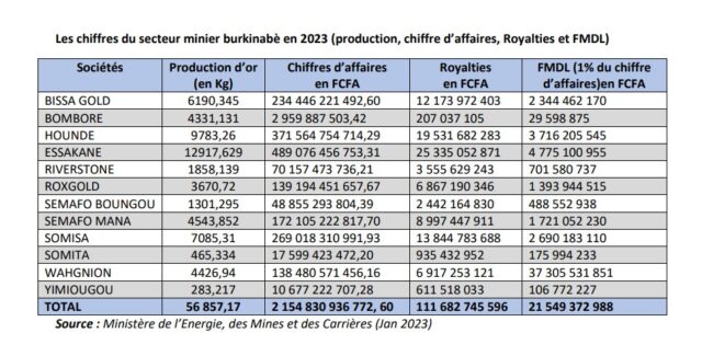 Les recettes directes au budget de l’Etat en 2023 s’élèvent à 529 milliards FCFA, contre 540 milliards de FCFA en 2022 et 470 milliards de FCFA en 2021. Les royalties ont été facturées à 111 682 milliards FCFA contre 103 milliards FCFA en 2022. Le fonds minier de développement local étant alimenté par 1% du Chiffre d’affaires des sociétés minières et 20% des royalties, la somme collectée en 2023 s’élève à 43,886 milliards FCFA dont 21,550 milliards FCFA représentant les 1% du chiffre d’affaires des sociétés minières en production et 22,336 milliards FCFA représentant 20% des royalties.
