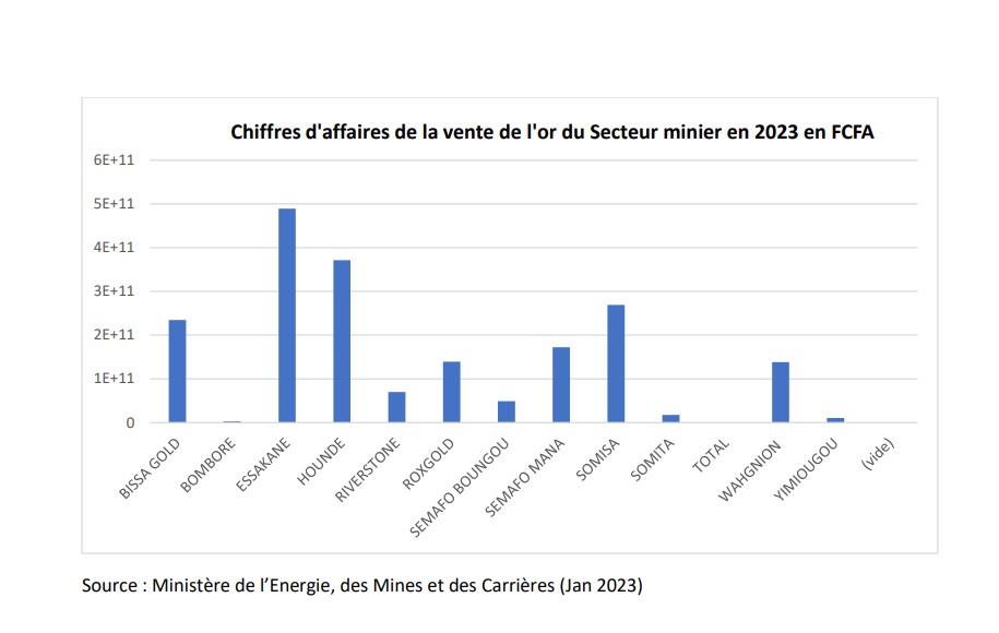 Au cours de l’année 2023, le cours de l’or a oscillé entre 1768 dollars l’once en septembre 2023 et 2078,4 dollars l’once en décembre 2023. Cette bonne tenue du cours de l’or a eu un impact sur les chiffres de la vente de l’or, la collecte des royalties et du Fonds minier de développement local (FMDL) auprès des sociétés minières pour compenser la baisse de la production. En effet, en fin 2023, l’or a été vendue pour un montant de 2 154,830 milliards FCFA, en hausse par rapport à 2022 (2084,757 milliards FCFA).
