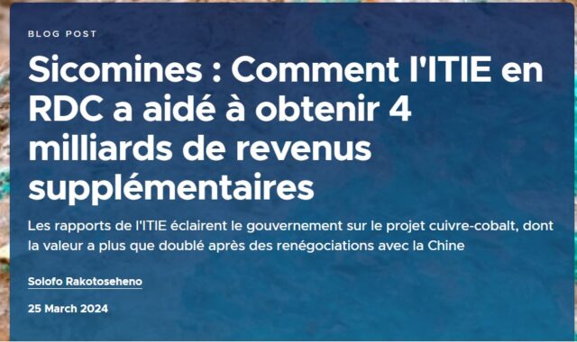 Le gouvernement congolais a récemment renégocié un énorme contrat minier signé avec des investisseurs chinois, aujourd’hui estimé à 7 milliards de dollars US, soit plus du double du montant du contrat initial (qui était de 3 milliards de dollars. Nous expliquons, dans notre dernier blog (FR) le rôle joué par l’ITIE dans cette renégociation.