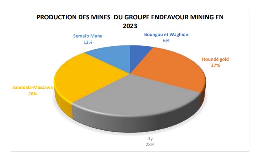 En 2023, le groupe Endeavour mining a produit 1,173 million d’onces (35,489 tonnes) d’or à des couts de production de 967 dollars l’once. Les actionnaires devraient se répartir de 266 millions de dollars, environ 160 milliards FCFA. Ces informations proviennent des résultats opérationnels et financiers de l’exercice 2023 qu’Endeavour mining a publié le 27 mars 2024 à Londres. Les détails de la production par mine indique: Ity 10,077 tonnes, Houndé gold, 9,704 tonnes, Sabodala-Massawa 9,144 tonnes, Semafo Mana, 4,416 tonnes. Boungou et Wahgnion ont produit 2,148 tonnes avant la vente en juin 2023. La production des 2 mines au Burkina Faso (Houndé gold et Mana) totalise 14,12 tonnes d’or représentant 39,786% de l’ensemble de la production du groupe. L’entreprise qui est à sa 11ème année consécutive de création a réalisé un bénéfice net de 138 milliards FCFA pour l’exercice 2023.