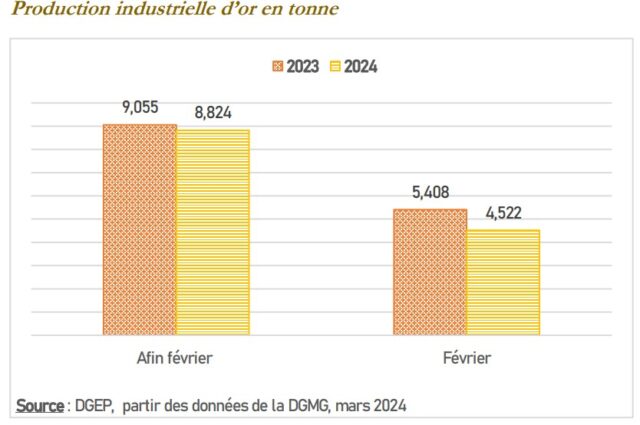 Entre janvier et février 2024, la production industrielle totale d’or est de 8,824 tonnes contre 9,055 tonnes à fin février 2023, soit une baisse de 2,6%. Selon la Direction générale de l’Économie et de la Planification (DGEP) qui a publié l’information dans son édition de mars 2024 du rapport de suivi de l’économie et du développement, la production industrielle d’or du seul mois de février 2024, s’élève à 4,522 tonnes, en hausse de 5,1% par rapport au mois de janvier 2024. Toutefois, comparée à son niveau en février 2023, la production d’or chute de 16,4%. Pour la DGEP, la hausse mensuelle de la production d’or en février 2024 tient principalement de l’augmentation de la production des mines de Roxgold Sanu (+216,4%), de Houndé Gold (+71,6%) et de SOMISA (Sanbrado) (+65,9%).