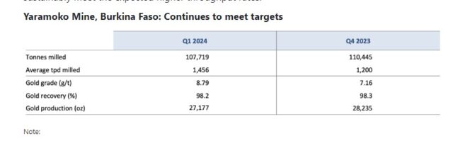 Au cours du premier trimestre 2024, la mine de Yaramoko au Burkina Faso a poursuivi la réalisation des objectifs. Elle a produit au premier trimestre 0,845 tonnes, soit une baisse de 4%. La production a été réalisée à une teneur moyenne de 8,79 grammes la tonne d’or, soit une baisse de 23% par rapport au quatrième trimestre 2023.