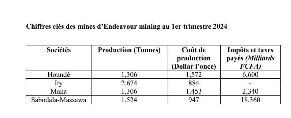 Endeavour Mining a publié à Londres ce 2 mai 2024, ces chiffres du premier trimestre 2024 dans un communiqué. Au cours du 1er trimestre 2024, les 4 mines du groupe ont produit 6,811 tonnes d’or. Au Burkina Faso, la mine de Houndé Gold a produit 1,306 tonnes d’or au premier trimestre 2024 à des coûts moyens de 1,572 dollars l’once d’or. Au cours de ce premier trimestre de l’année, elle a payé 6,600 milliards FCFA de taxes et d’impôts,