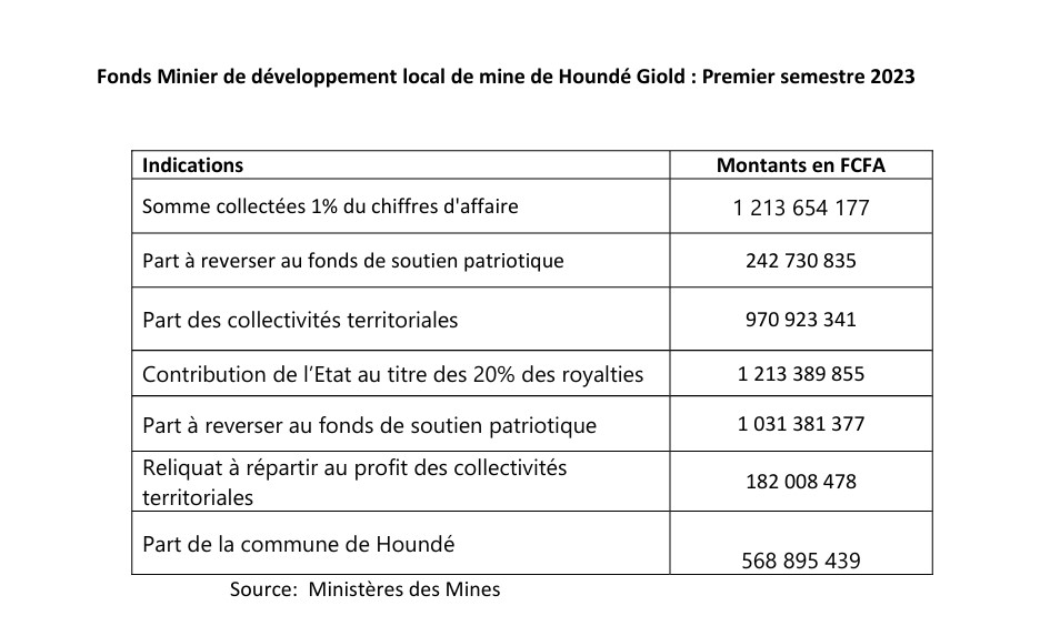 «Le projet minier Houndé Gold a effectué un paiement de 1 213 654 177 FCFA au titre des 1% de son chiffre d’affaires. La part à reverser au fonds de soutien patriotique est de 242 730 835 FCFA et le reliquat à répartir au profit des collectivités territoriales est de 970 923 341 FCFA», peut-on lire sur la page Facebook du ministère en charge des mines.