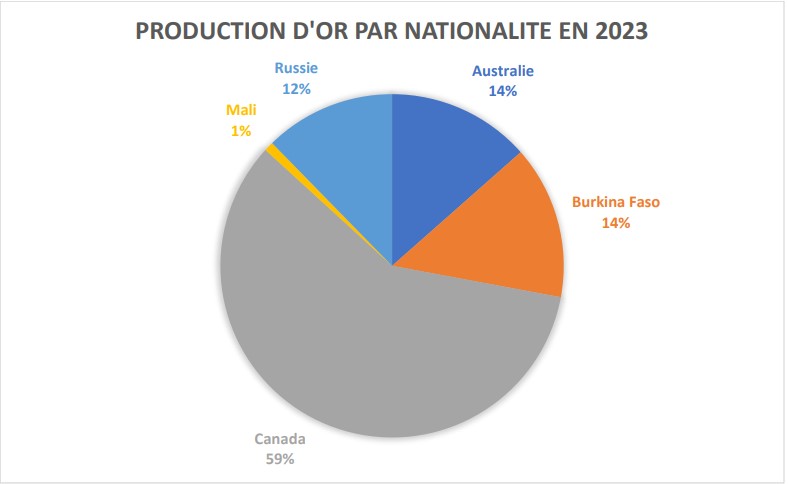 Le Burkina Faso a enregistré 12 sociétés minières en exploitation, en 2023. Sur les 12, on dénombre 05 d’origine canadienne, 03 burkinabè, 02 russes, 01 australienne et 01 malienne. En termes de production au cours de la même année, les sociétés canadiennes ont produit 35,251 tonnes d’or sur 56,857 tonnes produites par l’ensemble des sociétés exploitantes au Burkina Faso, soit 59% de la production.