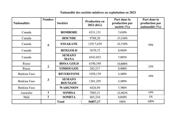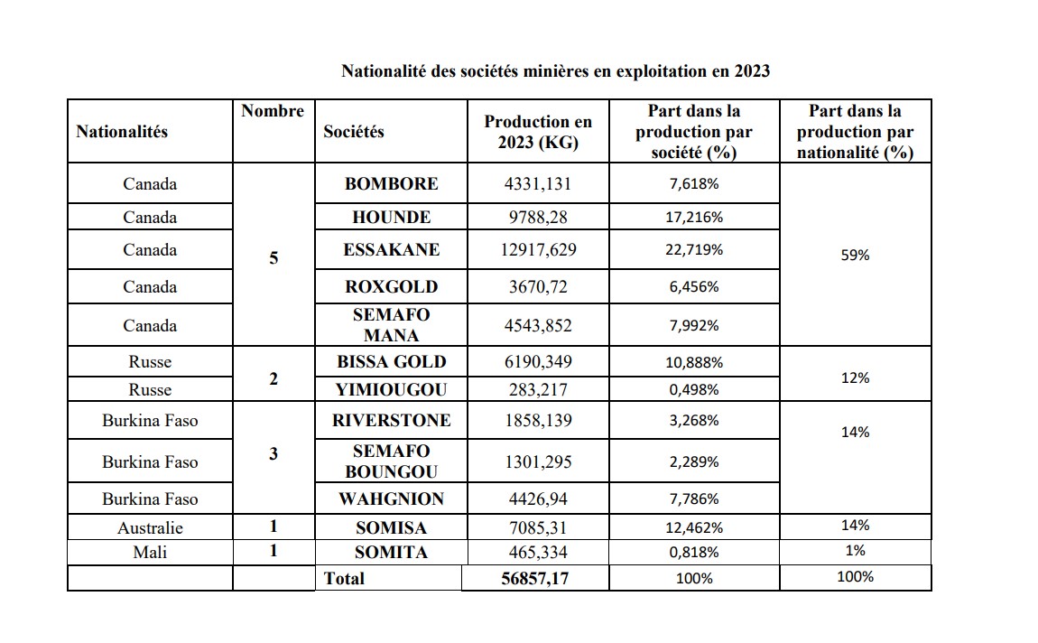 Le Burkina Faso a enregistré 12 sociétés minières en exploitation, en 2023. Sur les 12, on dénombre 05 d’origine canadienne, 03 burkinabè, 02 russes, 01 australienne et 01 malienne. En termes de production au cours de la même année, les sociétés canadiennes ont produit 35,251 tonnes d’or sur 56,857 tonnes produites par l’ensemble des sociétés exploitantes au Burkina Faso, soit 59% de la production.