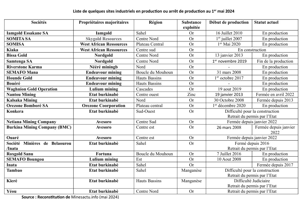 Des sites miniers industriels ont été localisés sur l’ensemble des 12 autres régions, même si tous ne sont pas actifs. Si certains qui sont fermés pour des raisons sécuritaires, d’autres le sont suite à la fin de l’exploitation ou pour des raisons de retraits de permis d’exploitation. Des sites fermés pour raison de sécurité, nous avons Nétiana, Ouaré, Youga dans la région du Centre sud. SOMITA SA dans le Centre Nord et Karma dans la région du Nord ont été momentanément fermés avant de rouvrir. Nantou Mining dans le Centre Ouest a été fermés et son permis retiré par l’Etat tout comme la Société Minières de Belaourou (Inata) dans le Sahel. A l’exception de la région du Centre Ouest qui n’abrite plus de site industriel après la fermeture de Nantou, le Centre Nord, la Boucle du Mouhoun, le Plateau central, les Hauts bassins, les Cascades et le Sahel abritent des sites fonctionnels. La région du Sud-Ouest abrite une seule mine industrielle. La société qui devait passer à la construction a rétrocédé le permis à l’Etat Burkinabè.