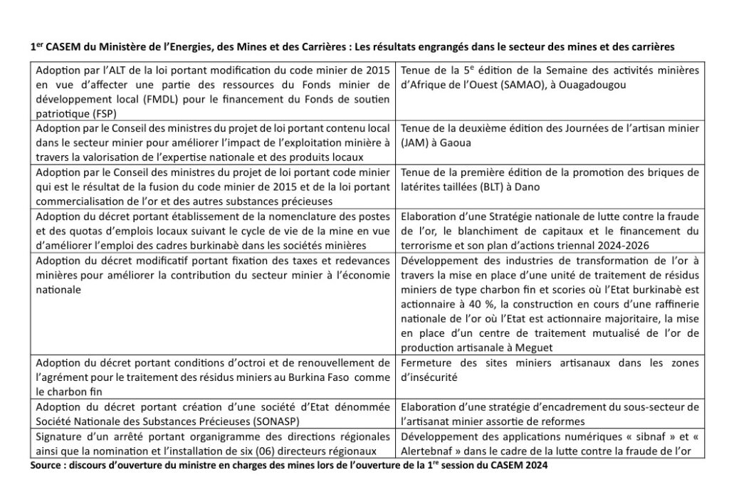 Le jeudi 23 mai 2024, le ministère de l’Energie, des mines et des carrières a organisé sa première session du Conseil d’administration du secteur ministériel (CASEM) de l’année 2024 à Ouagadougou. Placé sous le thème artisanat minier : quelle stratégie d’encadrement des artisans miniers pour plus de retombées socioéconomiques, ce premier CASEM a été l’occasion pour le ministre en charge des mines Yacouba Zabré Gouba de présenter les résultats, les difficultés et les perspectives de son département.