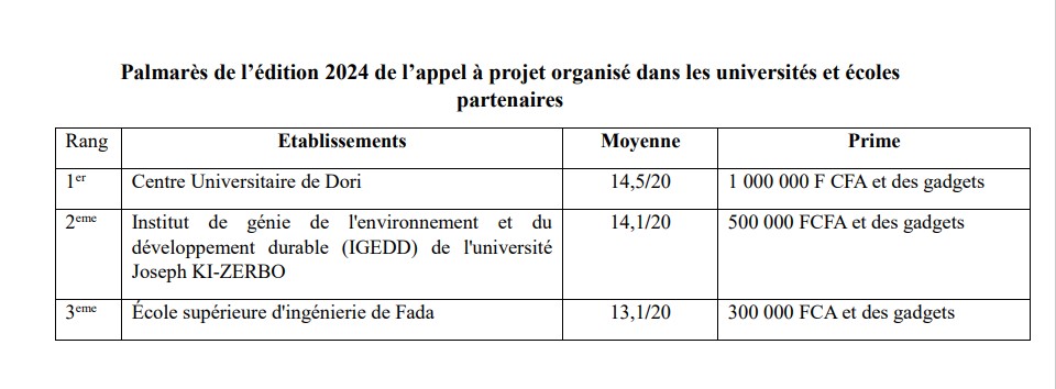 Pour cette édition, 34 projets ont été reçus. Au terme des délibérations, le projet du Centre universitaire de Dori sur la restauration des terres dégradées par la combinaison des méthodes mécaniques de récupération des terres a retenu l’attention du jury. Le représentant de l’équipe lauréate de la compétition de l’édition présente, Salif Sakandé note que la qualité et la faisabilité de leur projet a fait la différence auprès du jury. « Au vu de sa qualité de réalisation et sa préservation de l’environnement, cela a été un poids de plus sur notre projet », a-t-il renseigné. Au terme des délibérations, le projet du Centre universitaire de Dori sur la restauration des terres dégradées par la combinaison des méthodes mécaniques de récupération des terres a retenu l’attention du jury. Le projet utilise des légumineuses herbacées en association avec les microorganismes et les amendement organo- minéraux.