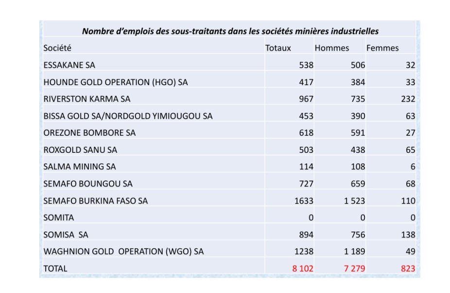 Ce taux est disparate en fonction des sociétés. La mine de SOMISA emploie le plus de femmes (121 sur un effectif de 602 personnes), soit 20,09% de femmes. Elle est suivie par la mine de Essakane (282 femmes sur un effectif de 2404), soit un taux de 11,63% et Houndé Gold, 9,6% de femmes.