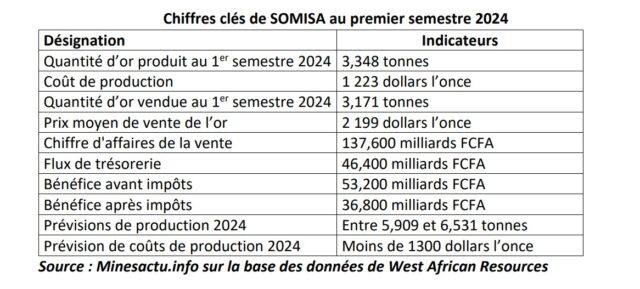Au premier semestre 2024, SOMISA a produit 3,348 tonnes d’or* (107 644 onces) selon un communiqué publié par West African Resources, le 26 août 2024, pour annoncer ses résultats financiers du premier semestre 2024.