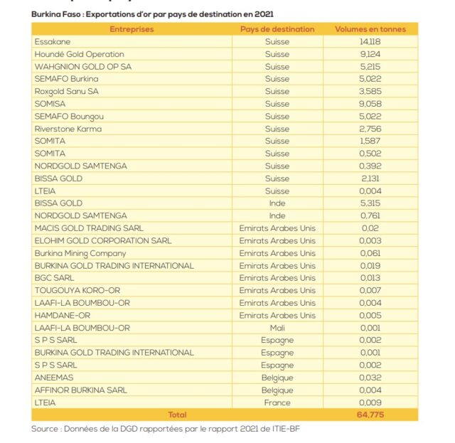 La Suisse est la principale plaque tournante du commerce international de l’or. Le pays abrite 05 raffineries d’or certifiées. Il s’agit de Argor-Heraeus, Metalor, PX Precinox, MKS PAMP et Valcambi. 04 parmi de ces raffineries figurent parmi les 9 plus grandes raffineries d’or au monde. La Suisse est le deuxième plus grand pays importateur d’or africain après les Emirats Arabes-Unis. En 2022, la Suisse a importé 2 410 tonnes du monde entier. En 2022, les plus grands pays exportateurs d’or vers la Suisse étaient le Burkina Faso et le Ghana.  Le Burkina Faso a exporté vers la Suisse en 2022, près de 68 tonnes d’or. Les exportations vers la Suisse entre 2012 et 2022 pourraient en fait être plus élevées parce qu’il est fort possible que de l’or africain ait été importé en Suisse via des pays tiers. Dans un tel cas, il est impossible de savoir dans quel pays l’or a été extrait, car seul le dernier pays où il a subi une transformation est déclaré aux douanes comme pays d’origine.