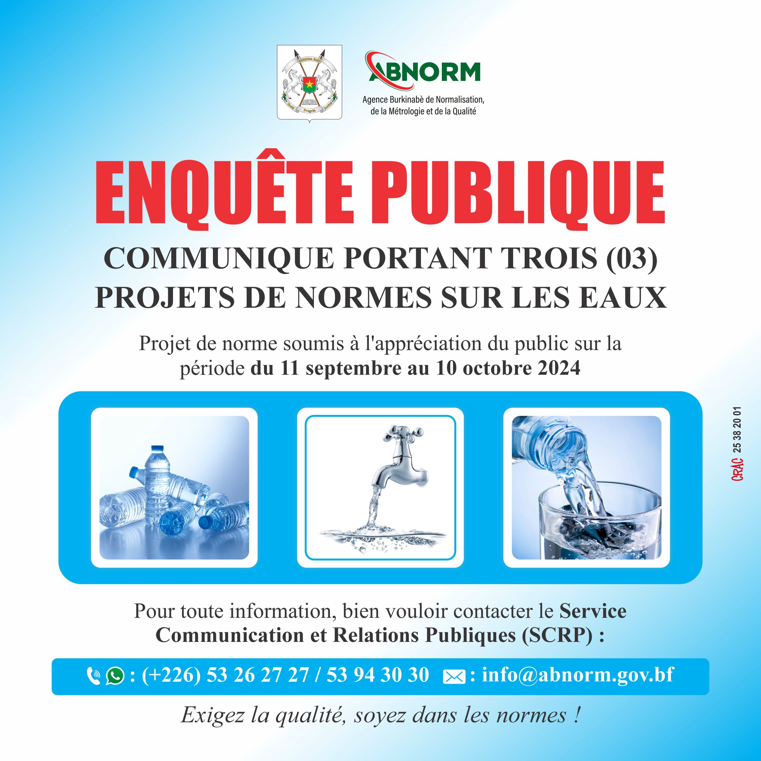 Le Directeur Général de l’Agence Burkinabè de Normalisation, de la Métrologie et de la Qualité (ABNORM) a le plaisir de porter à la connaissance du public, que trois (03) projets de normes portant sur leseaux ont été adoptées par le Comité Technique de Normalisation « Environnement ». Lesdits projets de norme sont soumis à l’appréciation du public sur une période d’un (01) mois allant du 11 septembre au 10 octobre 2024.