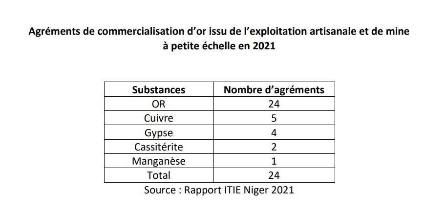 Ces écarts posant un problème de fiabilité des données du secteur, compte tenu des écarts relevés entre les différentes sources. Pour cette raison, l’ITIE estime que la commercialisation des substances issues de l’exploitation minière à petite échelle est confrontée aux problèmes de fausses déclarations, de fraude et d’évasion fiscale. La principale raison invoquée par les professionnels du métier est le poids de la fiscalité appliquée dans le domaine. Toutefois, les statistiques indiquent une amélioration depuis l’installation d’une usine d’affinage d’or à Niamey, faisant passer la quantité d’or exportée, en provenance des sites d’exploitation minière artisanale, de 313 kg en 2017 à 5,726 tonnes en 2018. En 2019, 5,958 tonnes d’or issues de l’exploitation artisanale et à petite échelle ont été commercialisées. Ce chiffre a évolué pour atteindre 18,307 tonnes en 2020, pour baisser à 14,021 tonnes en 2021. En 2021, le Niger a dénombré 24 détenteurs d’agréments de commercialisation d’or produit artisanalement et par la mine à petite échelle.