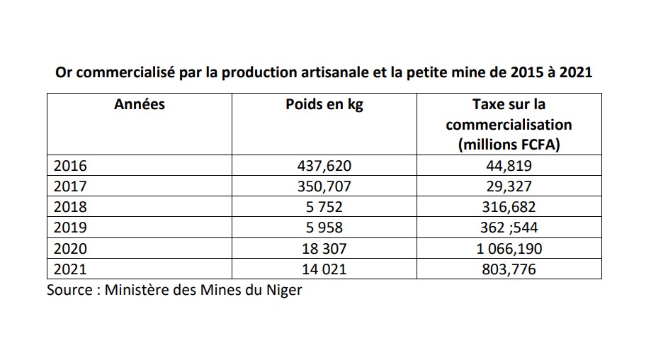 Ces écarts posant un problème de fiabilité des données du secteur, compte tenu des écarts relevés entre les différentes sources. Pour cette raison, l’ITIE estime que la commercialisation des substances issues de l’exploitation minière à petite échelle est confrontée aux problèmes de fausses déclarations, de fraude et d’évasion fiscale. La principale raison invoquée par les professionnels du métier est le poids de la fiscalité appliquée dans le domaine. Toutefois, les statistiques indiquent une amélioration depuis l’installation d’une usine d’affinage d’or à Niamey, faisant passer la quantité d’or exportée, en provenance des sites d’exploitation minière artisanale, de 313 kg en 2017 à 5,726 tonnes en 2018. En 2019, 5,958 tonnes d’or issues de l’exploitation artisanale et à petite échelle ont été commercialisées. Ce chiffre a évolué pour atteindre 18,307 tonnes en 2020, pour baisser à 14,021 tonnes en 2021. En 2021, le Niger a dénombré 24 détenteurs d’agréments de commercialisation d’or produit artisanalement et par la mine à petite échelle.