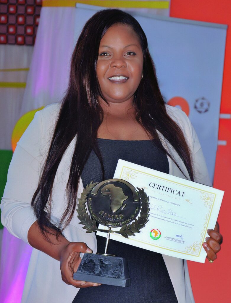 Maryse SEDOGO/TRAORE, Administratrice, Directrice Générale de Aurora reçoit un certificat et un trophée de reconnaissance du Comité d’Organisation de la SAMAO 2024 pour son entreprise authentiquement fière de servir l’Afrique à travers son expertise au profit des sociétés minières