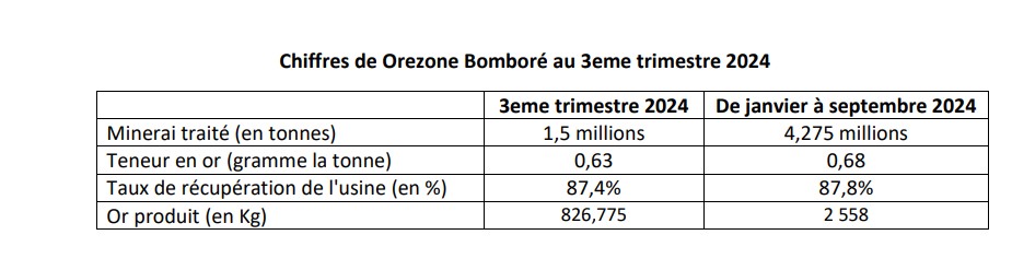 Orezone Gold Corporation a annoncé ce 17 octobre 2024 à Vancouver, ses résultats de production d’or du 3ème trimestre 2024 de sa mine d’or Bomboré. Durant ce trimestre, Bomboré a produit 826,775 Kg d’or, totalisant 2,558 tonnes depuis le début de l’année, selon le communiqué.
