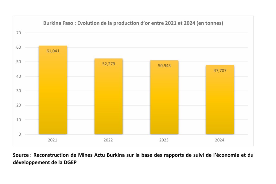 « A fin novembre 2024, la production totale d’or industrielle s’élève à 47,707 tonnes, ce qui correspond à un taux de réalisation de 80,4% par rapport à une prévision annuelle de 59,320 tonnes ». Ce chiffre a été communiqué par la Direction générale de l’Economie et de la planification (DGEP) dans l’édition de décembre 2024 de son rapport de suivi de l’économie et du développement. Pour la DGEP qui reprend les chiffres de la Direction générale des mines et de la géologie, ce chiffre marque une baisse de 9,2% par rapport à la même période en 2023, où le taux avait atteint 89,6%. En effet, en fin novembre 2023, le Burkina Faso avait produit 50,943 tonnes d’or contre 52,279 tonnes à fin novembre 2022. La baisse de la production industrielle est observée depuis 2021.