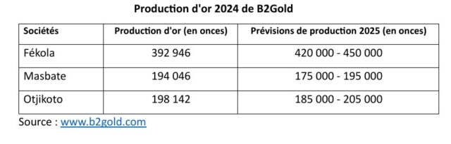 Dans un communiqué publié par la direction, la société B2Gold a annoncé une production de 804 778 onces (25,031 tonnes d’or) au compte de l’année 2024 pour une prévision comprise entre 24,883 et 27,060 tonnes d’or. Outre les résultats de la production d’or et les revenus générés, le communiqué a révélé les prévisions pour 2025.