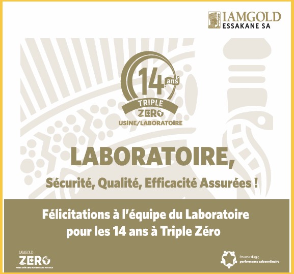 Le 15 octobre 2024, la direction adressait officiellement ses félicitations au laboratoire de son département Usine pour avoir effectué l’exploit de 14 années consécutives de travail à triple zéro, sans incidence ayant occasionné une aide médicale, une restriction ou un transfert de tâche, ni arrêt de travail. Erigé en modèle pour l’ensemble de la mine, le laboratoire par son dynamisme et son esprit d’équipe, a réitéré son engagement à renforcer la culture d’entreprise d’Iamgold Essakane SA.