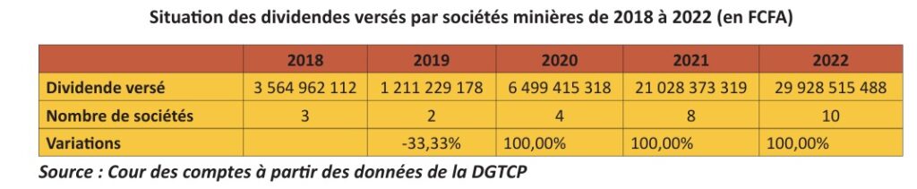 Les dividendes versés après une forte chute en 2019 ont connu un accroissement significatif progressif de 2019 à 2022, dû essentiellement à l’accroissement du nombre de sociétés contributrices qui est passé de 3 en 2018 à 10 sociétés en 2022. Ce nombre demeure toujours faible au regard du nombre de sociétés minières qui doivent verser des dividendes. Il a été relevé que certaines sociétés minières versent régulièrement des dividendes à l’Etat mais les délais ne sont pas toujours respectés. Par ailleurs, il arrive que les sociétés minières distribuent des dividendes aux actionnaires sans en attribuer à l’Etat, suite à la publication et à la consultation des informations boursières. Enfin, le nombre (2 au maximum) des administrateurs de l’Etat dans les Conseils d’administration des sociétés minières ne permet pas de faire basculer les décisions des Conseils d’administration et des Assemblées généraux. Mais, leur présence devrait en principe permettre d’informer et d’alerter l’administration sur les décisions préjudiciables à l’Etat. Il ressort des entretiens avec le Trésor public que les administrateurs représentants l’Etat dans ces conseils d’administration ne rendent pas compte régulièrement de leur participation dans les entités minières. A propos du non-paiement des dividendes, il est relevé que les dividendes prioritaires ne sont pas inscrits dans les statuts des sociétés minières et l’absence de sanctions administratives pour le non versement à l’Etat du dividende prioritaire favorise le non-paiement. Les administrateurs participent aux assemblées générales sans avoir des orientations claires des tutelles technique et financière. Enfin les sociétés constituent chaque année les réserves sans tenir compte du seuil prévu par OHADA.