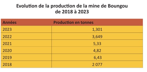 La reprise de la production va contribuer à revoir à la hausse la production globale du pays en 2025.En 2023, la mine a produit 1301,291 tonnes malgré les difficultés. En 2022, sa production était de 3,649 tonnes. Cette production était à 5,33 tonnes en 2021.