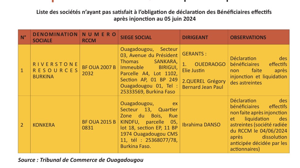 Au 05 juin 2024, elles sont 2 sociétés n’ayant pas satisfait à l’obligation de déclaration des bénéficiaires effectifs après injonction, note la Cour des comptes. C’est notamment Riverstone Resources Burkina avec une « déclaration des bénéficiaires effectifs non faite après injonction et liquidation des astreintes », relève la Cour des comptes et Konkera avec une « déclaration des bénéficiaires effectifs non faite après injonction et liquidation des astreintes », relève la Cour des comptes. Pour le cas de Konkéra, la Cour note que la société a été radiée du Registre du commerce le 04 juin 2024 après dissolution anticipée décidée par les actionnaires.